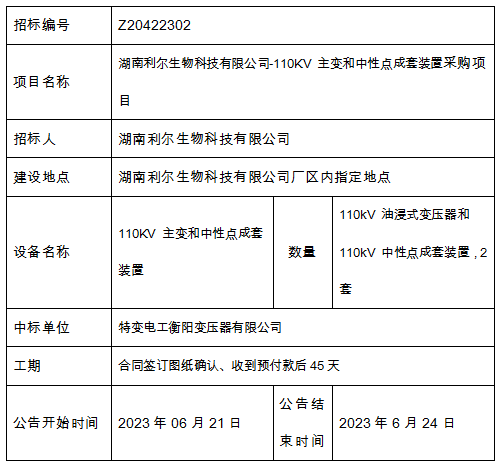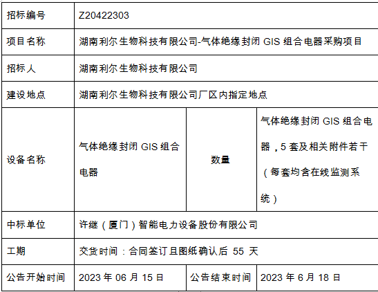 關(guān)于Z20422303-湖南利爾生物科技有限公司-氣體絕緣封閉GIS組合電器公開招標采購結(jié)果公示:招標編號Z2042...