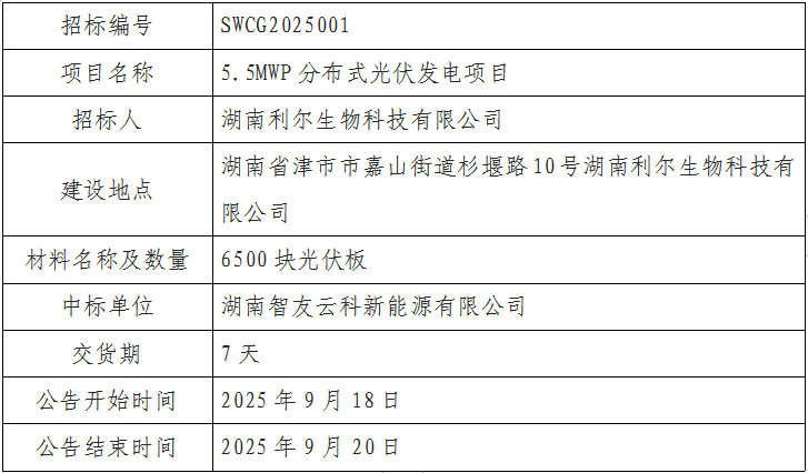 關于公開招標SWCG2025001-湖南利爾生物科技有限公司5.5MWP分布式光伏發電項目-6500塊光伏板的采購結果公示:
